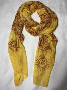 This beautiful golden Om meditation scarf is sure to enhance your meditations and spiritual practices. It is decorated with the mantra “Om,” the primordial sound of the universe. This light-weight cotton scarf is a loose gauze weave that is hand loomed, so variations are natural and part of the product’s character. Suitable for both men and women. Machine washable. Scarf measures approximately 23″ x 48″.