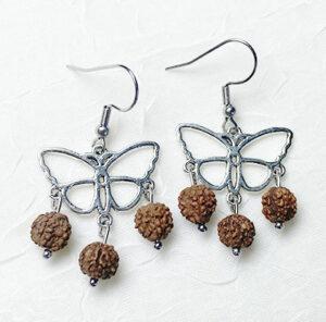 3 sacred rudraksha beads adorn each antiqued, silver-tone butterfly earring. These earrings feature hypo-allergenic, surgical stainless steel French hook ear wires. Earrings measure approximately 1 ¾” in length (including ear hook).