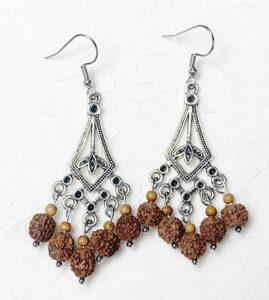 5 white sandalwood beads and 5 sacred rudraksha beads adorn each antiqued, silver-tone chandelier earring. Sandalwood is known to increase one’s spiritual awareness and deepen meditations. These earrings feature hypo-allergenic, surgical stainless steel French hook ear wires. Earrings measure approximately 2 ¾” in length (including ear hook).