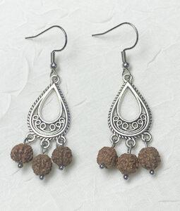 3 sacred rudraksha beads adorn each antiqued, silver-tone teardrop earring. These earrings feature hypo-allergenic, surgical stainless steel French hook ear wires. Earrings measure approximately 2 ¼” in length (including ear hook).